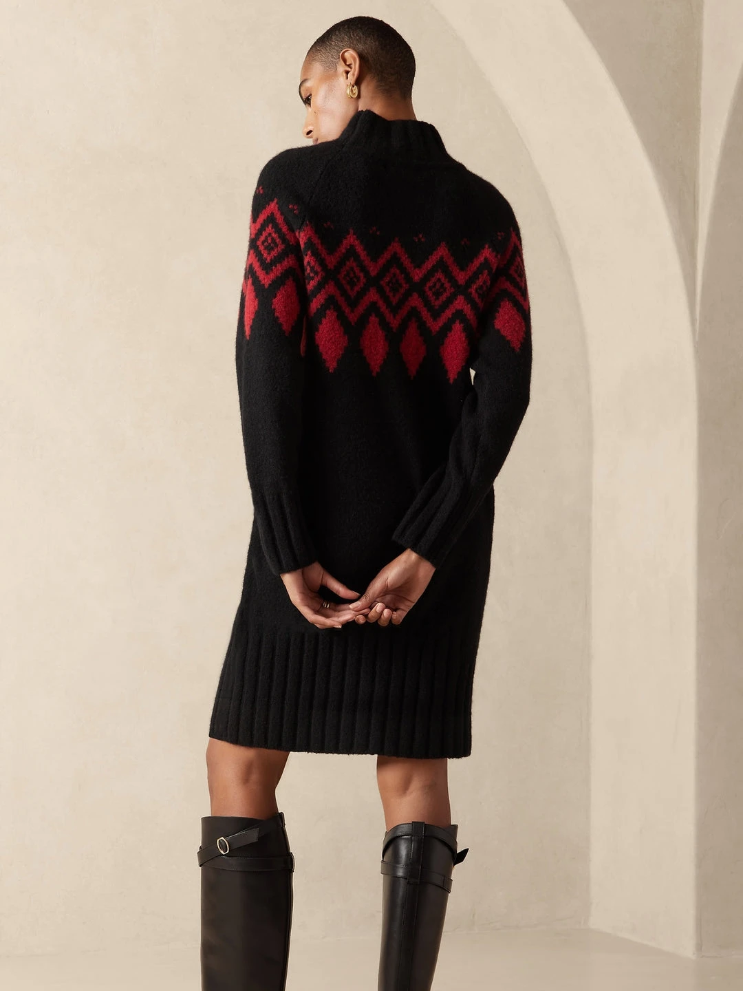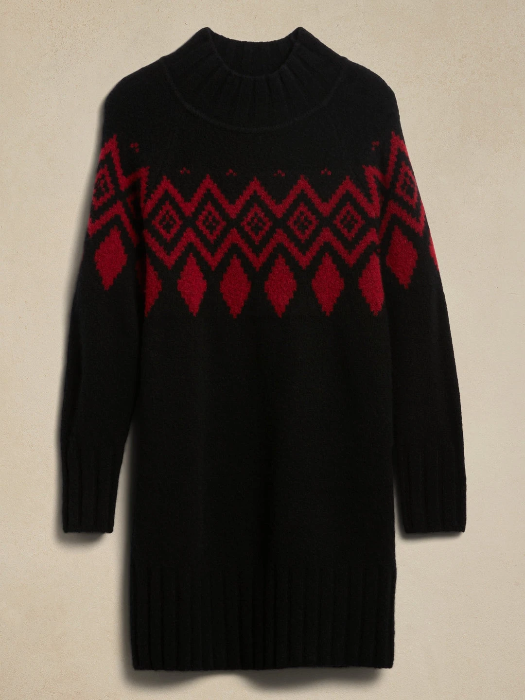 Fashioned with our favorited fairisle design, this warm and cozy sweater dress will delight throughout the season with a splendid blend of luxurious wool and yak, complete with ribbed-knit detail at the collar, cuffs and hem. COLUMN FIT – Expertly cut for a straight fit – no waist definition. SUSTAINABILITY – Made with recycled polyester. Column Fit – Semi-fitted through the chest, straight through the waist, hip, and thigh. Long sleeves. Midi length. Body length (size S) – Regular 34.5″, Tall 36″ Sleeve length – Regular 31″, Tall 33″ Model – Size S, 5’10” (178cm).