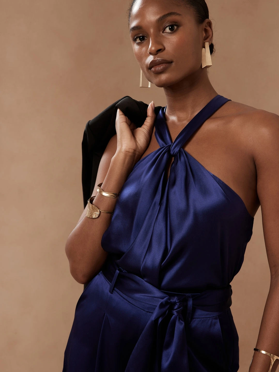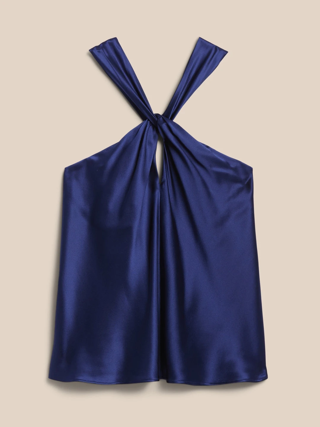 Luxurious and infinitely flattering, this halter top is inspired by vintage scarf tops. Here, a bias-cut silk charmeuse fabric creates exceptional draped elegance to carry you from season to season. RELAXED FIT – Expertly cut for a loose fit. Halter neck with twist front, eyelet opening and twist back. Lined at the front. Relaxed fit. Sleeveless. Hip length. Body length (size S) – Petite 17.5″, Regular 18.5″, Tall 20″ Model – Size S, 5’10” (178cm).