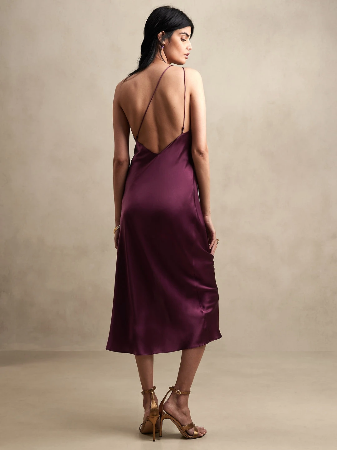 A spectacle of silk fabrication, this gorgeous dress is cut on the bias for incredible drape, with a dramatic scooped back and high slit at the side. Watch it glide in soft, elegant silk charmeuse that shimmers with every move you make. Breathable, Machine Washable. A-LINE – This flowy skirt has a flattering, A-line fit. One shoulder neckline with adjustable straps. High slit on wearer’s left leg. Lined bodice, unlined skirt. A-line – High waisted. Fitted through the waist and hip, gently flared from hip to hem. Sleeveless. Midi length. Body length (size S) – Regular 44″, Tall 47″ Model – Size S, 5’10” (178cm).
