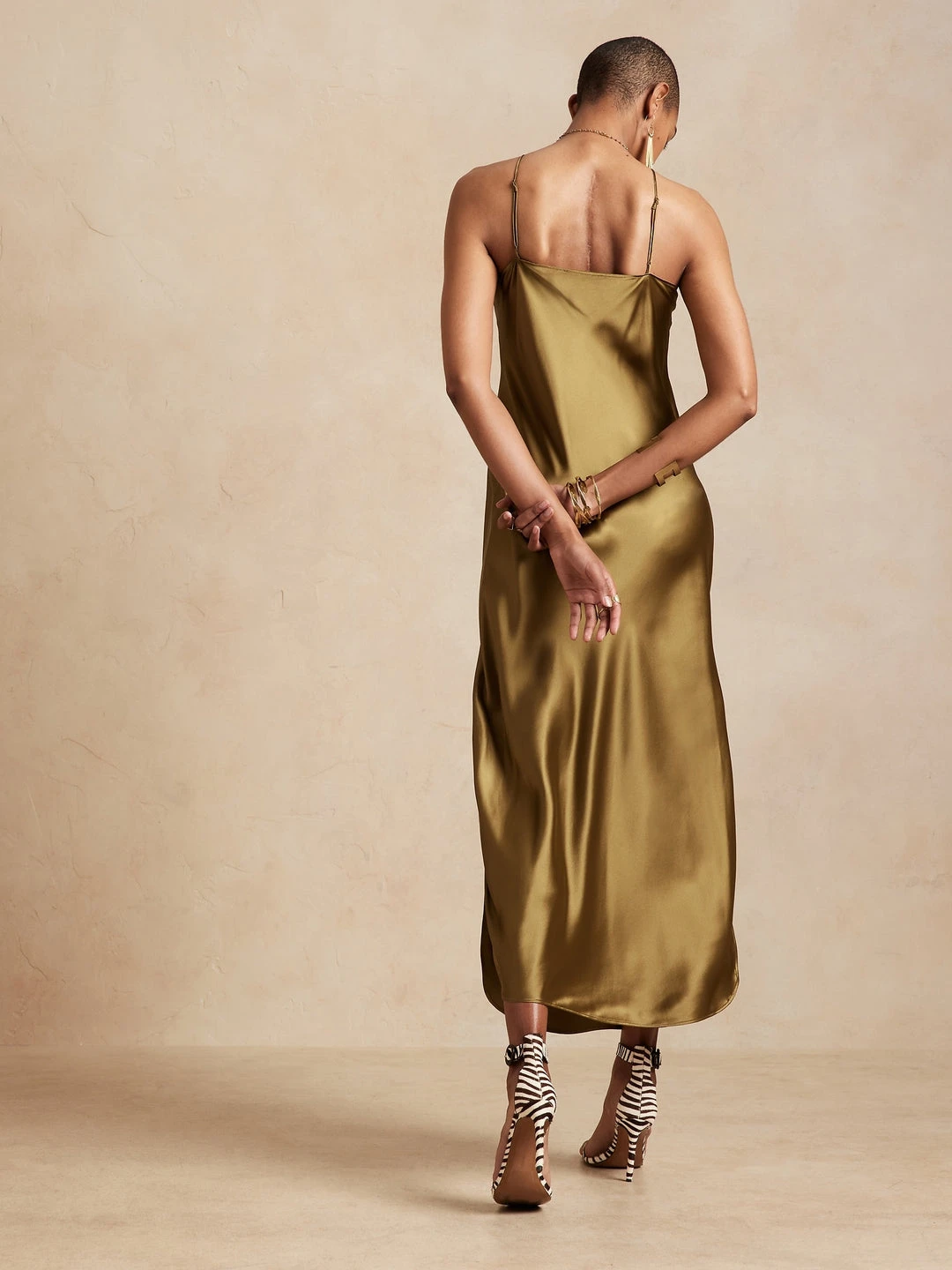 Crafted from glossy silk charmeuse, this washable slip dress is luxury at its best as its cut on the bias to give it stunning drape. COLUMN FIT – Semi-fitted, straight through the waist, hip, and thigh. V-neck with adjustable slider straps. Rounded shirttail hem with 22″ side slits. Unlined. Column Fit – Semi-fitted through the chest, straight through the waist, hip, and thigh. Sleeveless. Maxi length. Front body length (size S) – Petite 53.5″, Regular 57″, Tall 60.5″ Model – Size S, 5’10” (178cm).