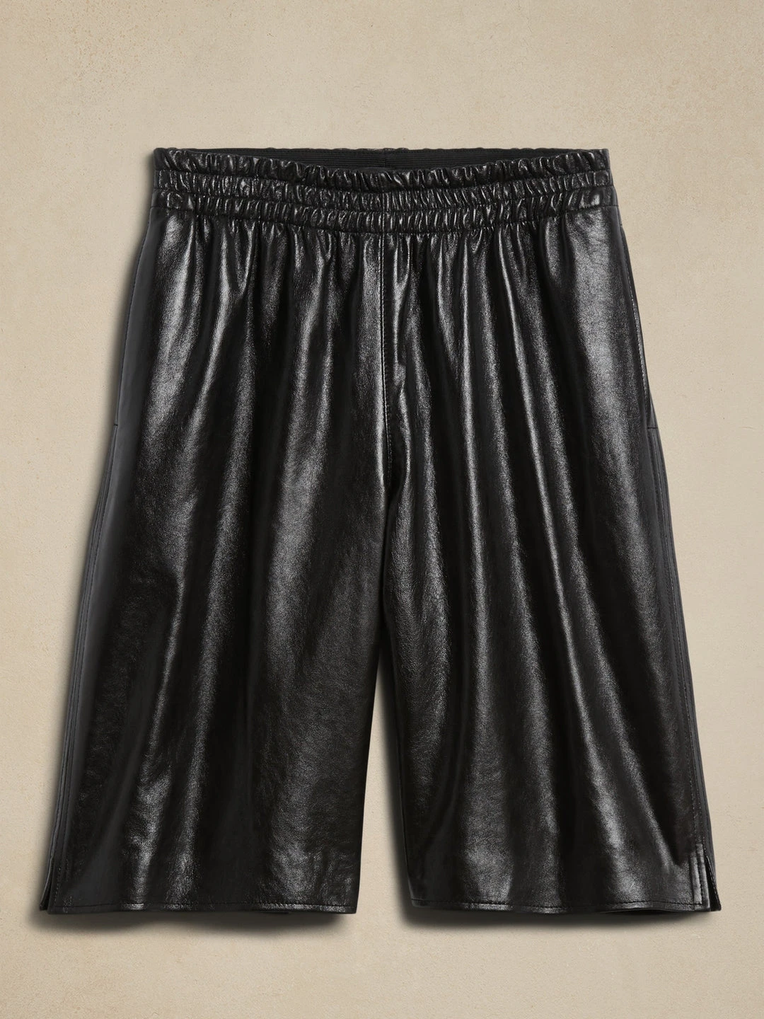 Equal parts sophisticated and sporty, this leather Bermuda short is crafted from indulgent, luxurious leather with pull-on design and relaxed silhouette that pairs easily with sneakers and an oversized button-down shirt or juxtaposed against a cashmere bralette and heels. STRAIGHT FIT – High-waisted. Fitted at the waist with relaxed, straight leg. Elastic waistband. Side pockets. Vented hem. Straight Fit – High-rise (13.5″). Fitted at the waist with relaxed, straight leg. Mid-thigh length. Inseams – Petite/Short 10″, Regular 10.5″, Long 11″ Model – Size S, 5’10” (178cm).