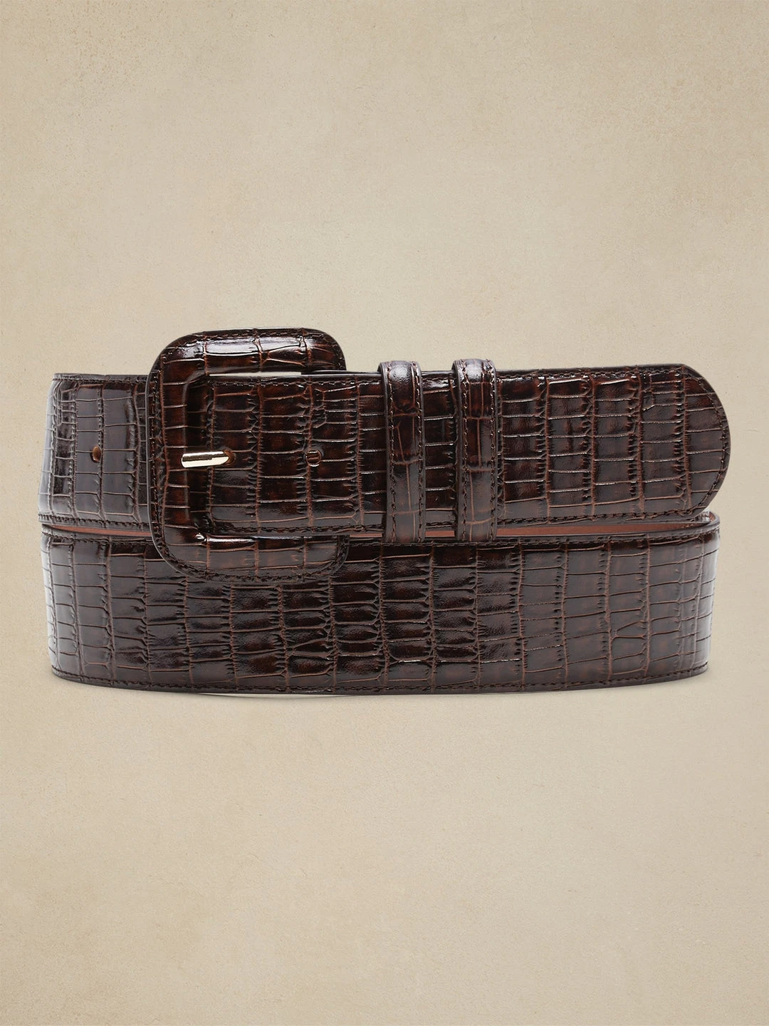 A statement-making accessory, wear this opulent leather belt on days that beckon for a boost of optimism as the embossed crocodile-effect leather exudes shining confidence. Width – 2″ (5cm)