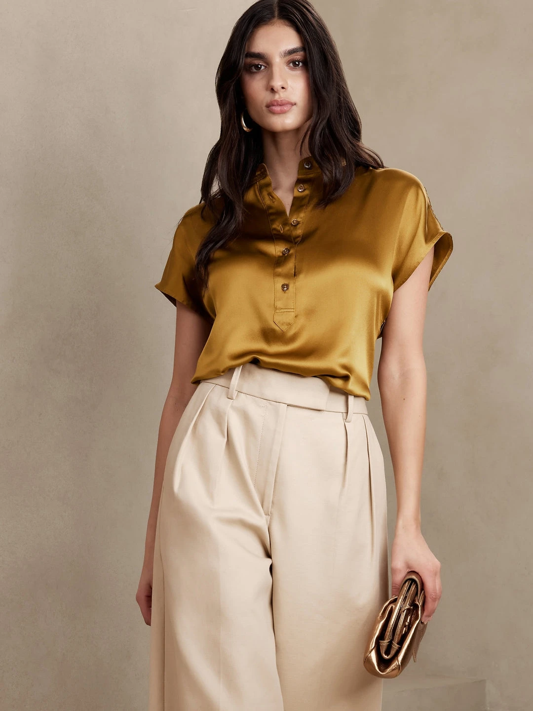 Effortless and sophisticated, this tunic shirt is crafted from luxurious silk charmeuse with a dolman sleeve, banded collar and beautiful troca-shell buttons- a lightweight and flowy essential when temperatures soar. OVERSIZED FIT – Cut for a loose, relaxed fit with a dropped shoulder. Banded collar with button placket. Curved hem with side slits. Oversized fit. Short sleeves. Tunic length. Body length (size S) – Petite 25.5″, Regular 27″, Tall 28.5″ Model – Size S, 5’10” (178cm).