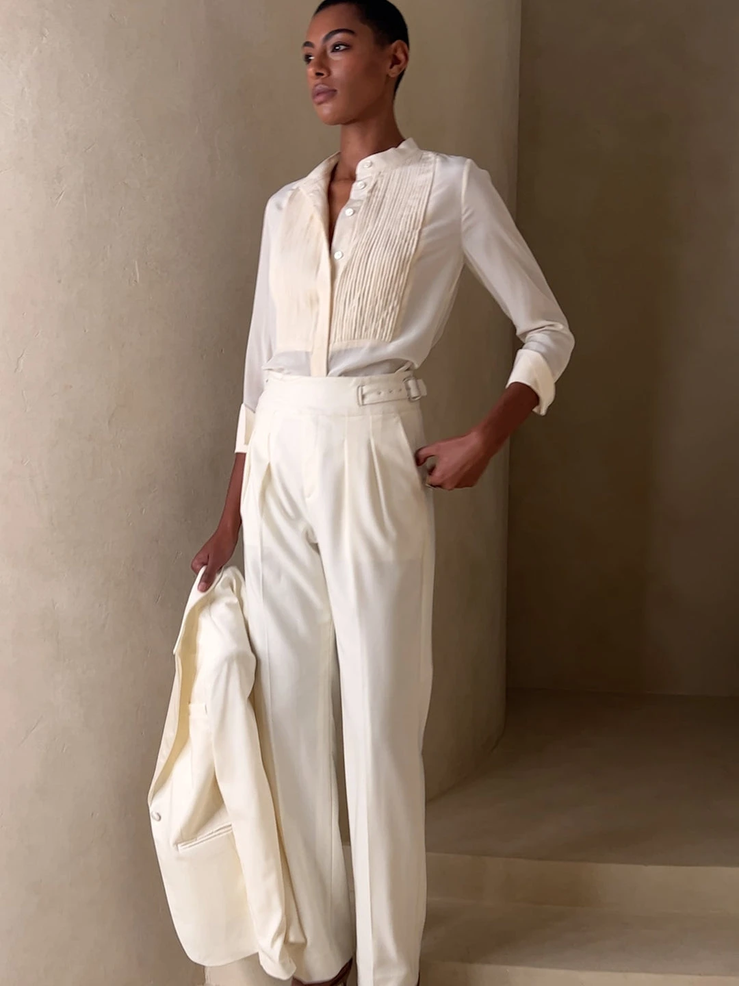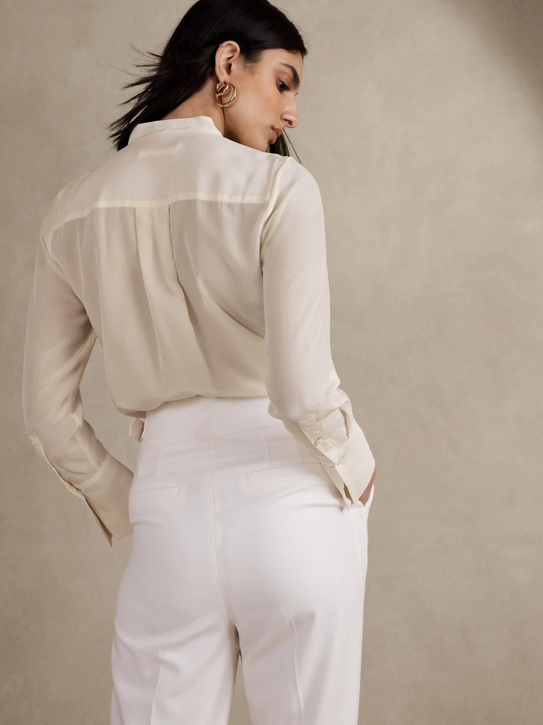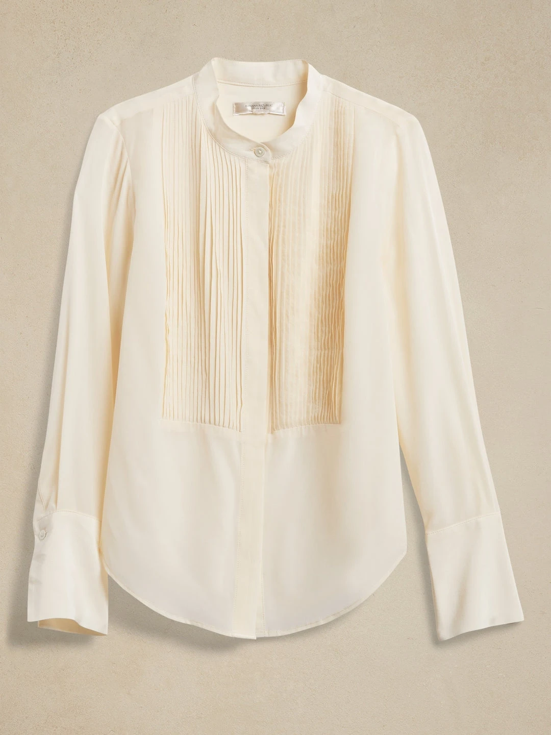 Cut from subtly pebbled silk crepe de chine, this timeless, tailored shirt has intricate, tuxedo-style pin-tucks at the front bib and a concealed button placket at front for a refined finish. SEMI-FITTED – Cut for a not-too-tight, not-too-loose fit. Banded collar. Button front. Shirttail hem. Semi-fitted. Long sleeves. Below-hip length. Body length (size S) – Regular 27″, Tall 29″ Sleeve length from center back – Regular 32″, Tall 34″ Model – Size S, 5’10” (178cm).