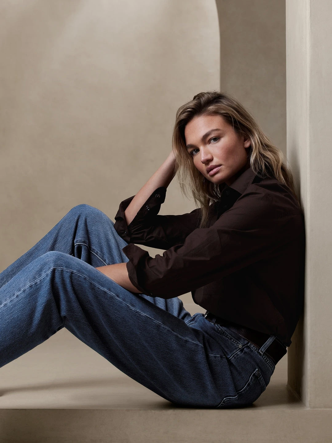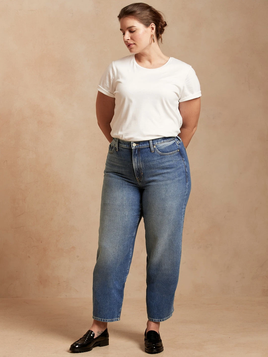 Almost a denim trouser, this high-rise barrel-leg jean is casual enough for archived t-shirts longing for a place in the sun. Ours has a freeing shape that pairs equally well with more elevated sweater designs. BARREL LEG – Also known as Balloon Leg, this high waisted fit has a distinctive wide cut that gently curves away from the leg. SUSTAINABILITY – Made with luxuriously soft, lightweight and eco-friendly TENCELβ’ lyocell and recycled cotton. NO STRETCH – This rigid denim has been specially washed for an already broken-in feel with no stretch. Zip fly with hook-and-bar closure. Five-pocket styling. Our denim is made under strict guidelines to ensure that the water used in washing and dyeing is safe and clean before it is released into the environment. High rise (10.5″). Fitted hip, straight thigh and rounded leg. Full length. Inseams – Short 28″, Regular 30″, Long/Tall 33″ Model – Size 25 or 32, 5’10” (178cm)