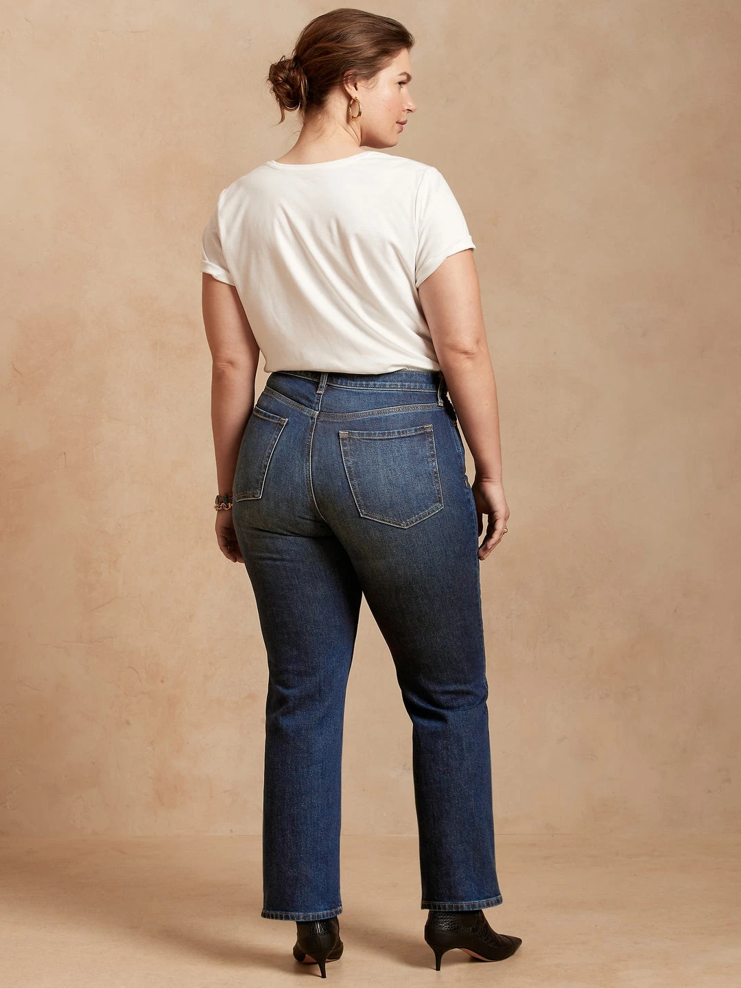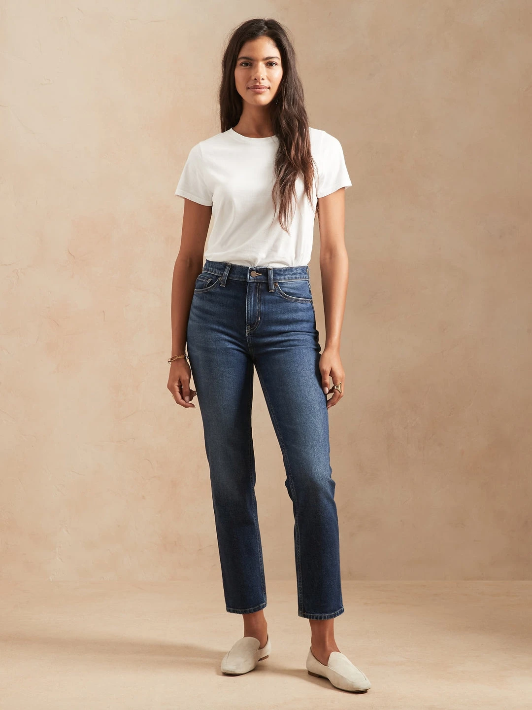 HIGH-RISE STRAIGHT FIT – Cut slim through the hip and thigh, with a straight, stovepipe-style fit through the leg. SUSTAINABILITY – Made with certified, organically grown cotton that’s easier on the earth. Zip fly with button closure. Belt loops. Five-pocket styling. Our denim is made under strict guidelines to ensure that the water used in washing and dyeing is safe and clean before it is released into the environment. Straight Fit – High rise (11″). Sits at the waist. Fitted through the hip and thigh, straight leg. Ankle length. Ankle length. Inseams – Petite/Short 25.5″, Regular 27.5″, Tall 30.5″ Model – Size 25 or 32, 5’10” (178cm)