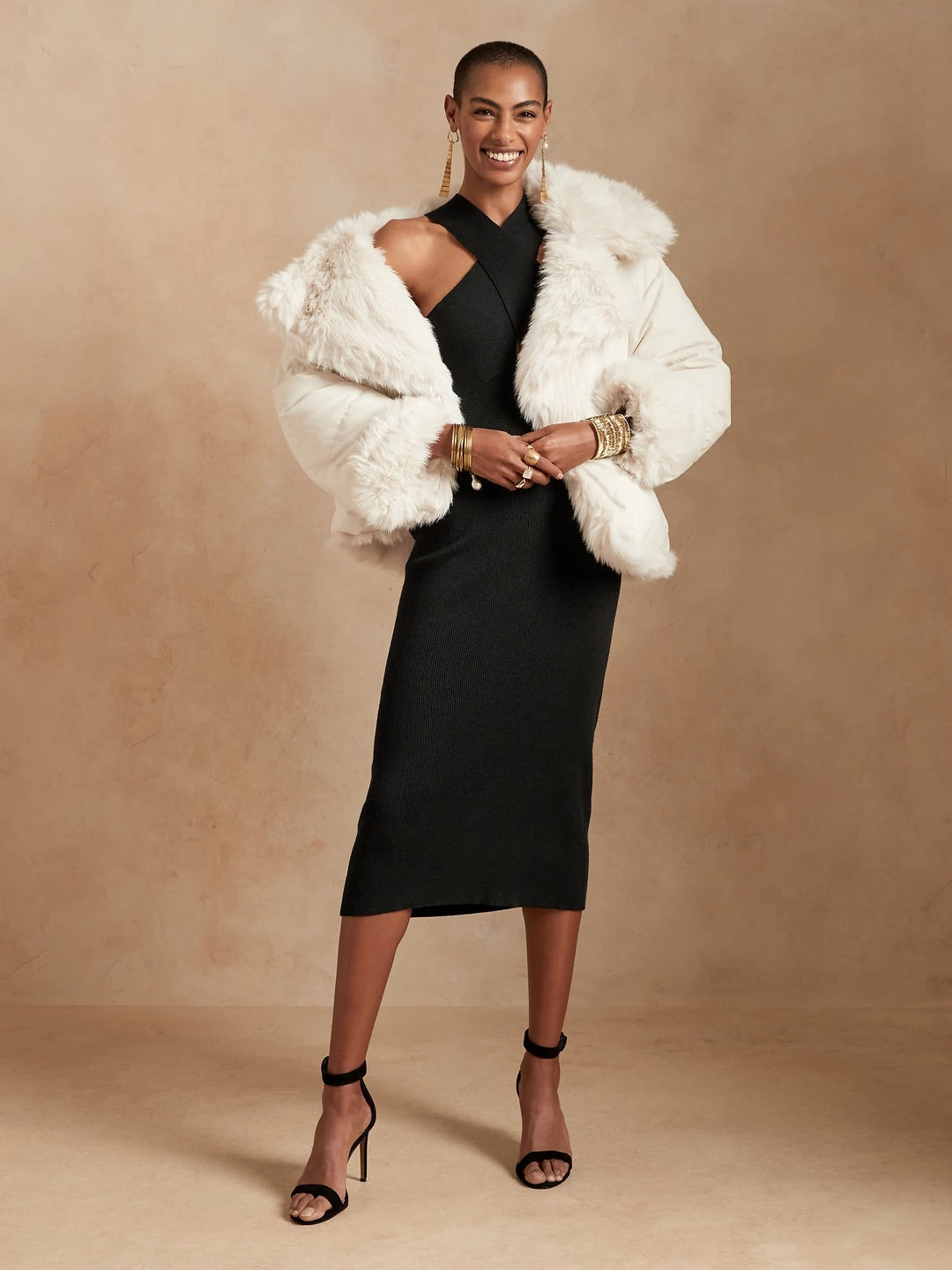 Dial up the drama with this sleek, sweater dress, designed with a cross-front halter neckline and cutout back, and crafted in a soft, yet substantial knit fabric with enough stretch to fit and flatter. SHEATH FIT – Expertly tailored to fit. SUSTAINABILITY – Made with LENZING™ ECOVERO™, a breathable fiber derived from certified renewable wood sources, produced using methods that reduce water impact and emissions by up to 50% compared to traditional viscose. Halter cross neck. Unlined. Sheath Fit – Fitted through the chest, waist, and hips. Sleeveless. Midi length. Body length from high point shoulder (size S) – Petite 42 “, Regular 45″, Tall 47″ Model – Size S, 5’10” (178cm).